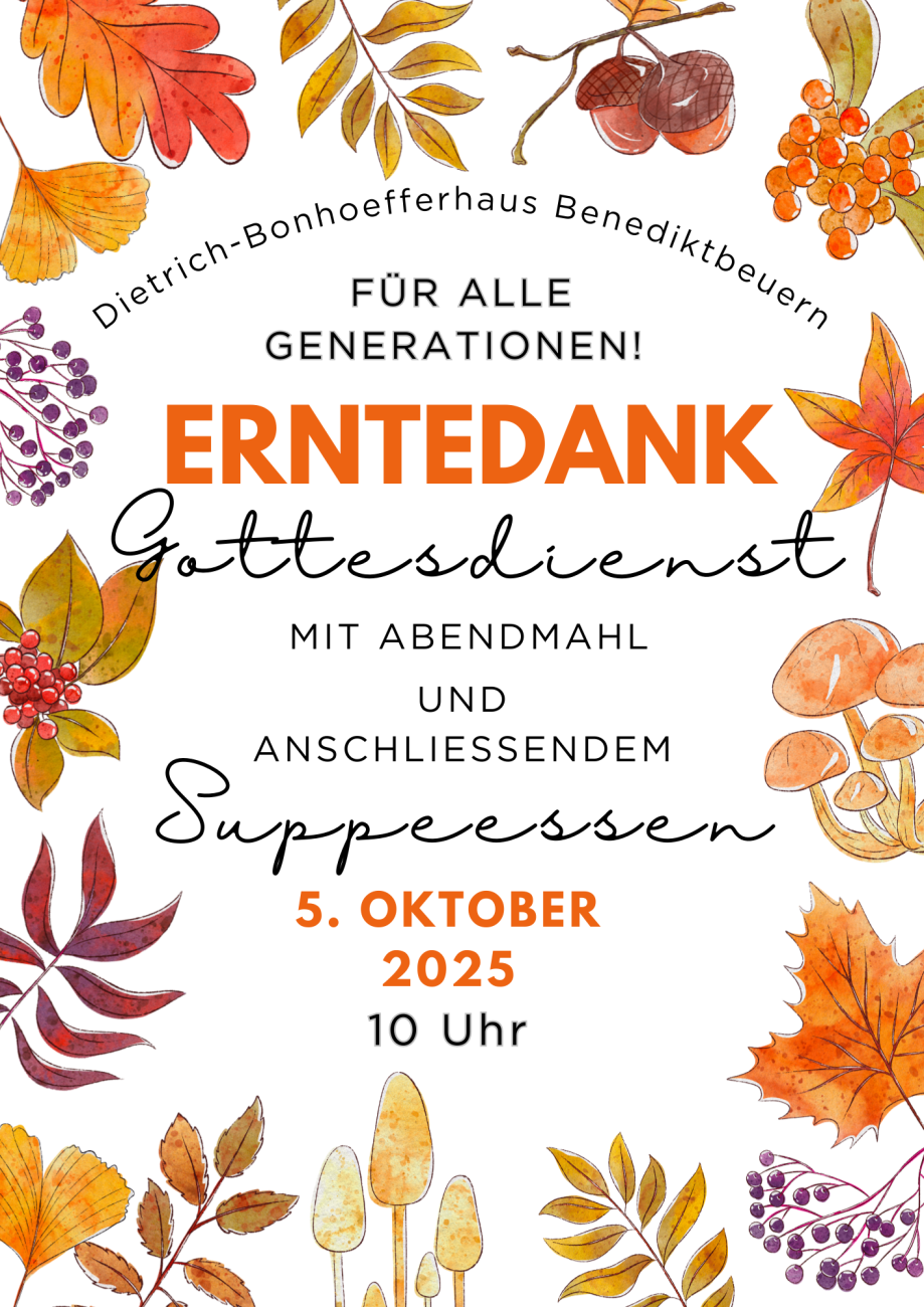 Am Sonntag, den 5. Oktober 2025 um 10 Uhr feiern wir mit einem Gottesdienst für alle Generationen das Erntedankfest im Dietricht-Bonhoefferhaus in Benediktbeuern.
